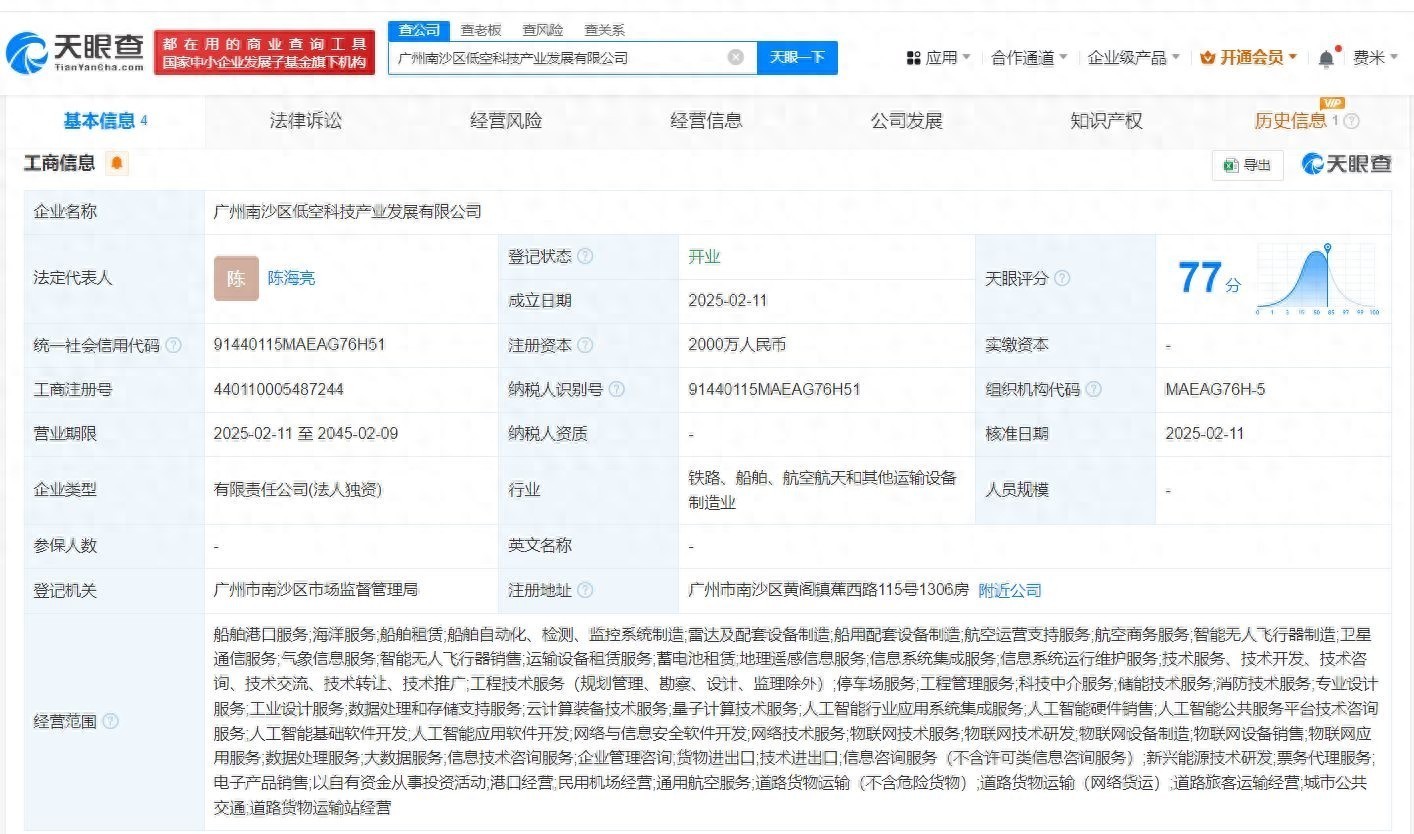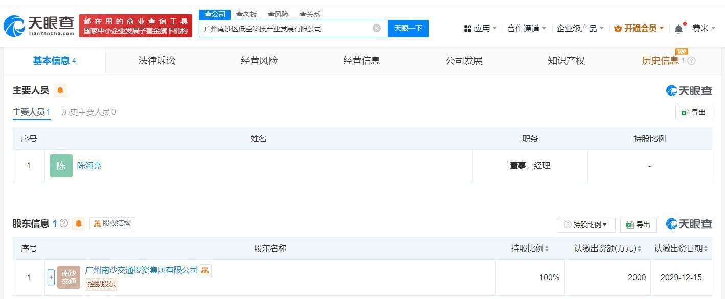 天眼查App显示,近日,广州南沙区低空科技产业发展有限公司成立,法定代表人为陈海亮,注册资本2000万人民币,经营范围含航空商务服务、智能无人飞行器制造、卫星通信服务、人工智能行业应用系统集成服务、人工智能硬件销售、人工智能公共服务平台技术咨询服务等,由广州南沙交通投资集团有限公司全资持股。